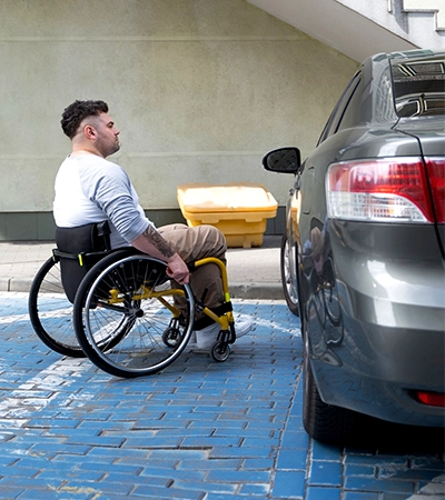 - In ‘on-street’ disabled parking bays, which are marked with a blue wheelchair symbol. You can park here for as long as you need, unless the signs say a specific time limit.