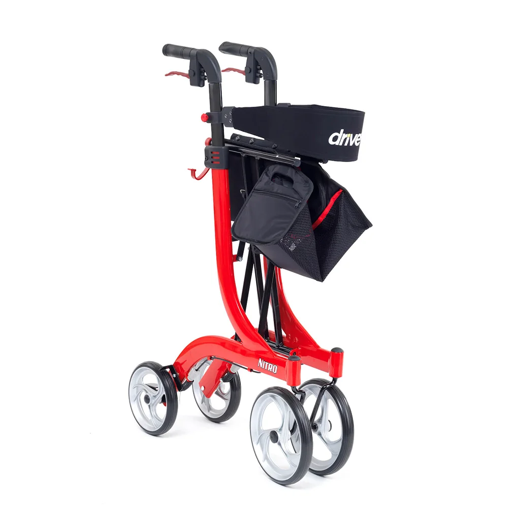 The Nitro Rollator is a high-class lightweight Rollator for both indoor and outdoor use and features a convenient singlehanded folding mechanism. It features a removable zippered storage bag and a soft, flexible backrest. It easily folds to a compact size for storage and portability.
